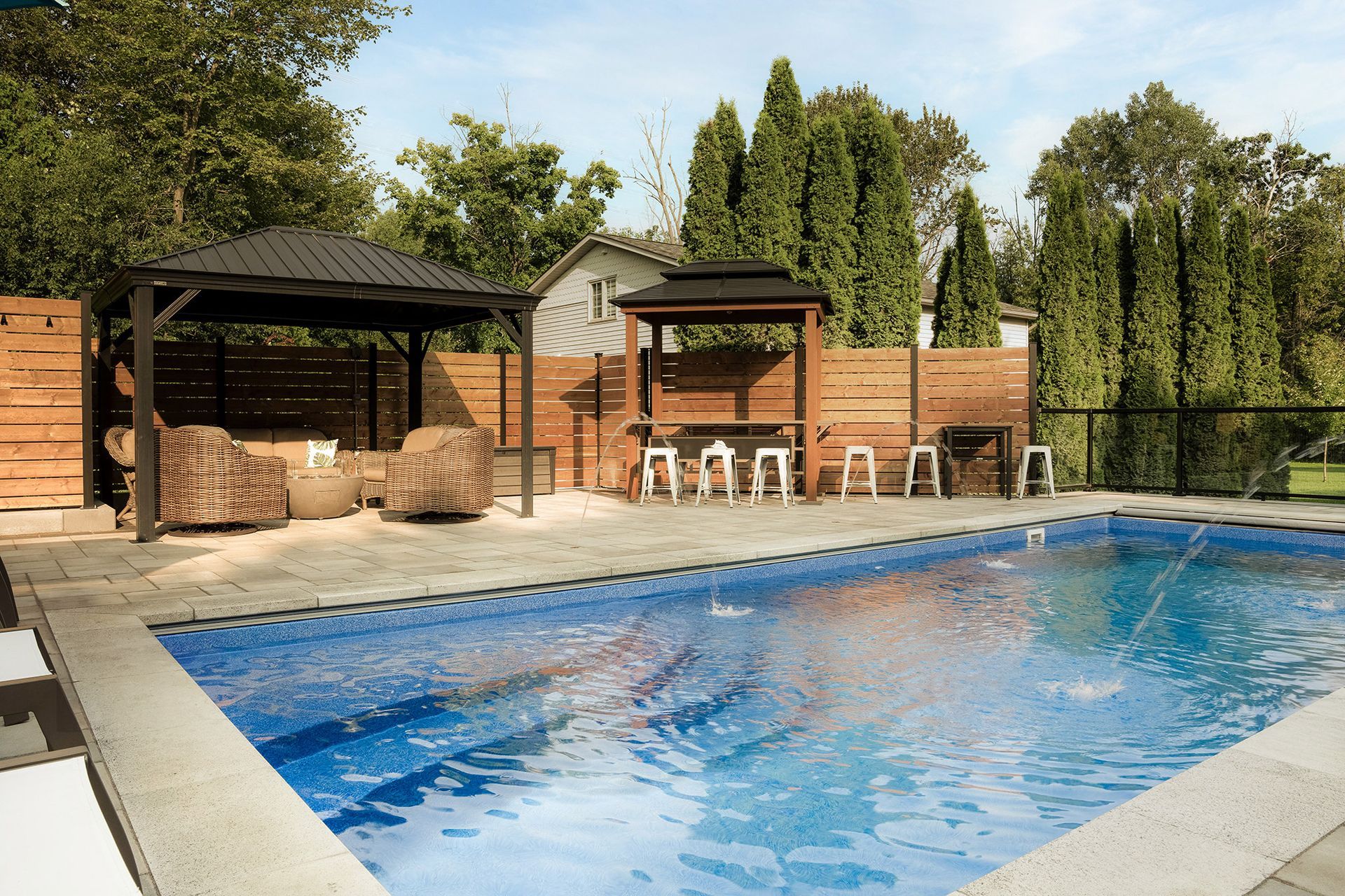 Transforming a Courtice Backyard, Latham Fiberglass Pool, Automatic Pool Cover, Unilock Patio, Custom Pergola
