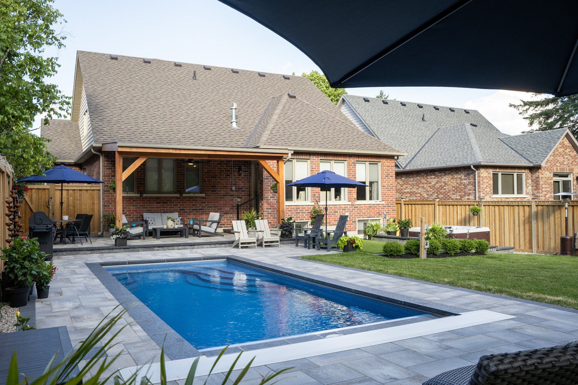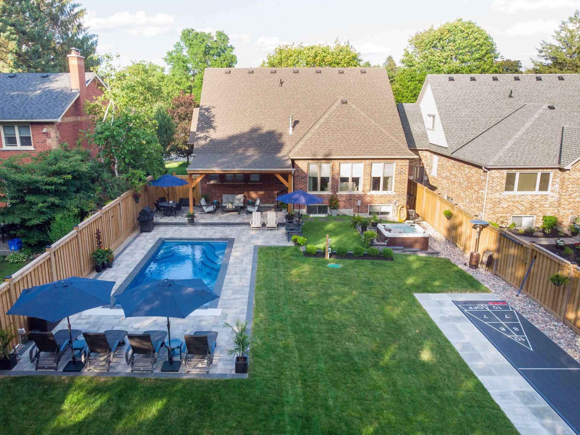 Living in a subdivision does not need to deter your dreams of having the perfect backyard oasis. This gorgeous project features a porch pavilion, Latham fibreglass pool with auto cover, a hot tub, shuffleboard and ample green space for additional games & activities. It serves as both the ideal spot to relax or allows you the option to entertain to your heart’s content!