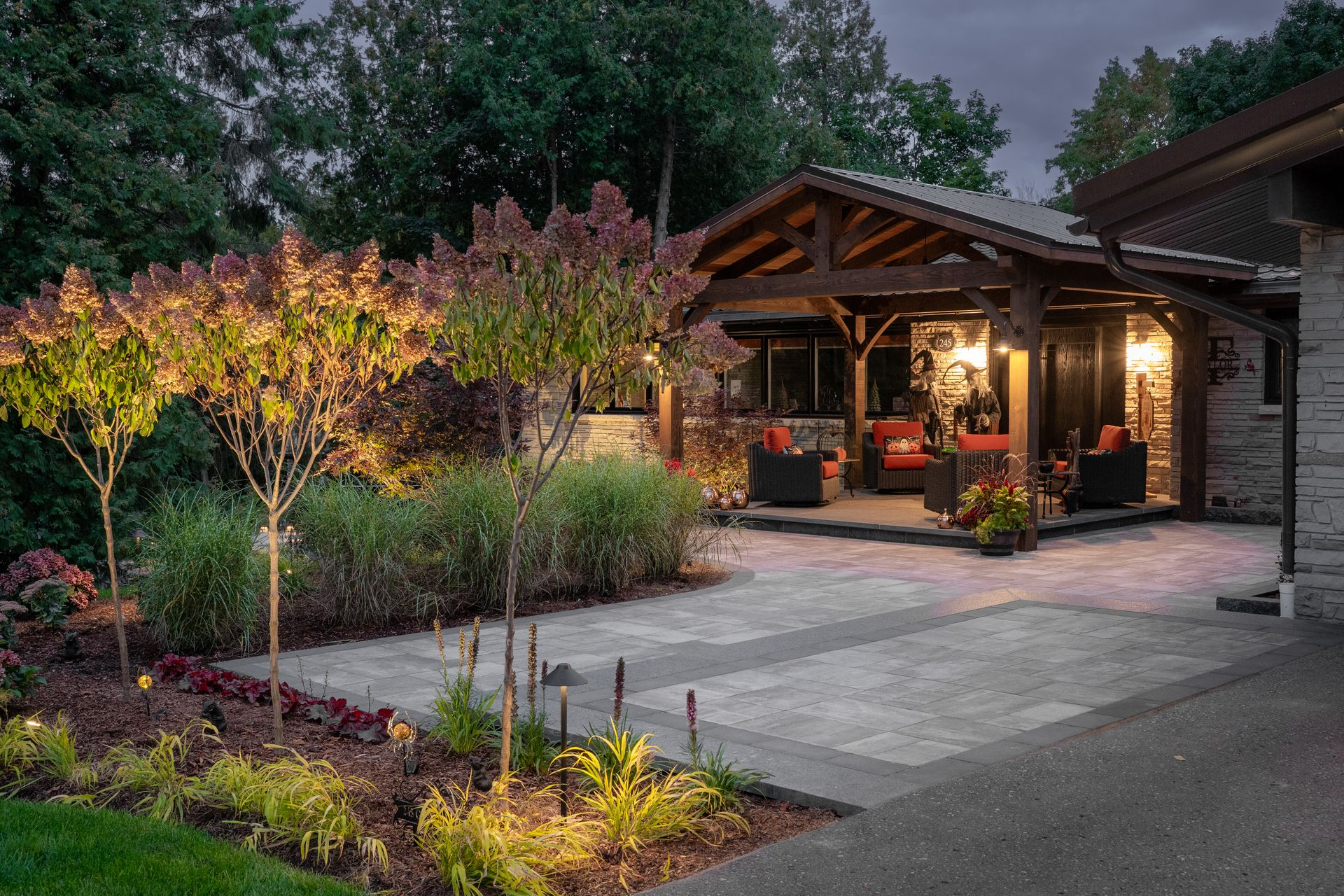 Completing the transformation is a large Unilock walkway and patio entrance that ties the entire landscape all together. The spacious stone design provides an elegant pathway leading up to the pavilion and front door, while the modern layout and subtle contrasts in stone colour enhance depth and dimension.