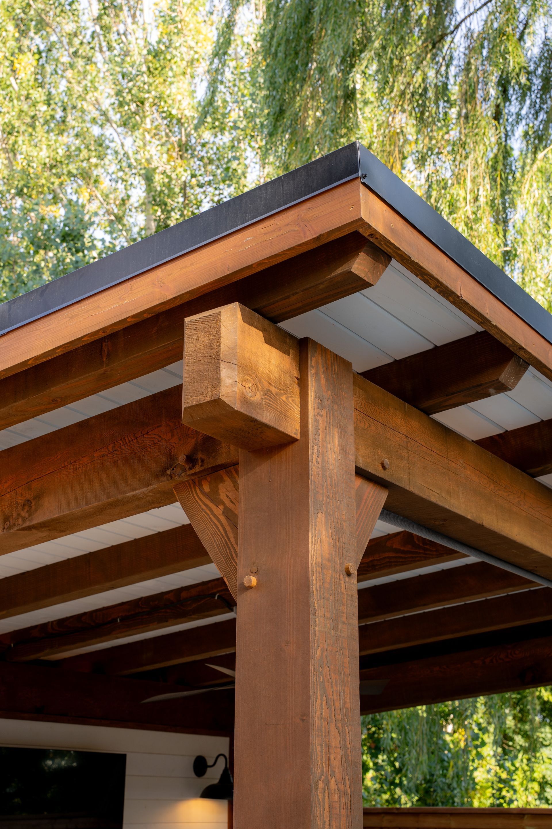 The handcrafted timber pavilion brings warmth and structure to the space, offering a shaded lounge area ideal for family gatherings or quiet afternoons. Its natural wood tones contrast beautifully with the surrounding materials, creating a cozy and inviting focal point that defines the outdoor living area.
