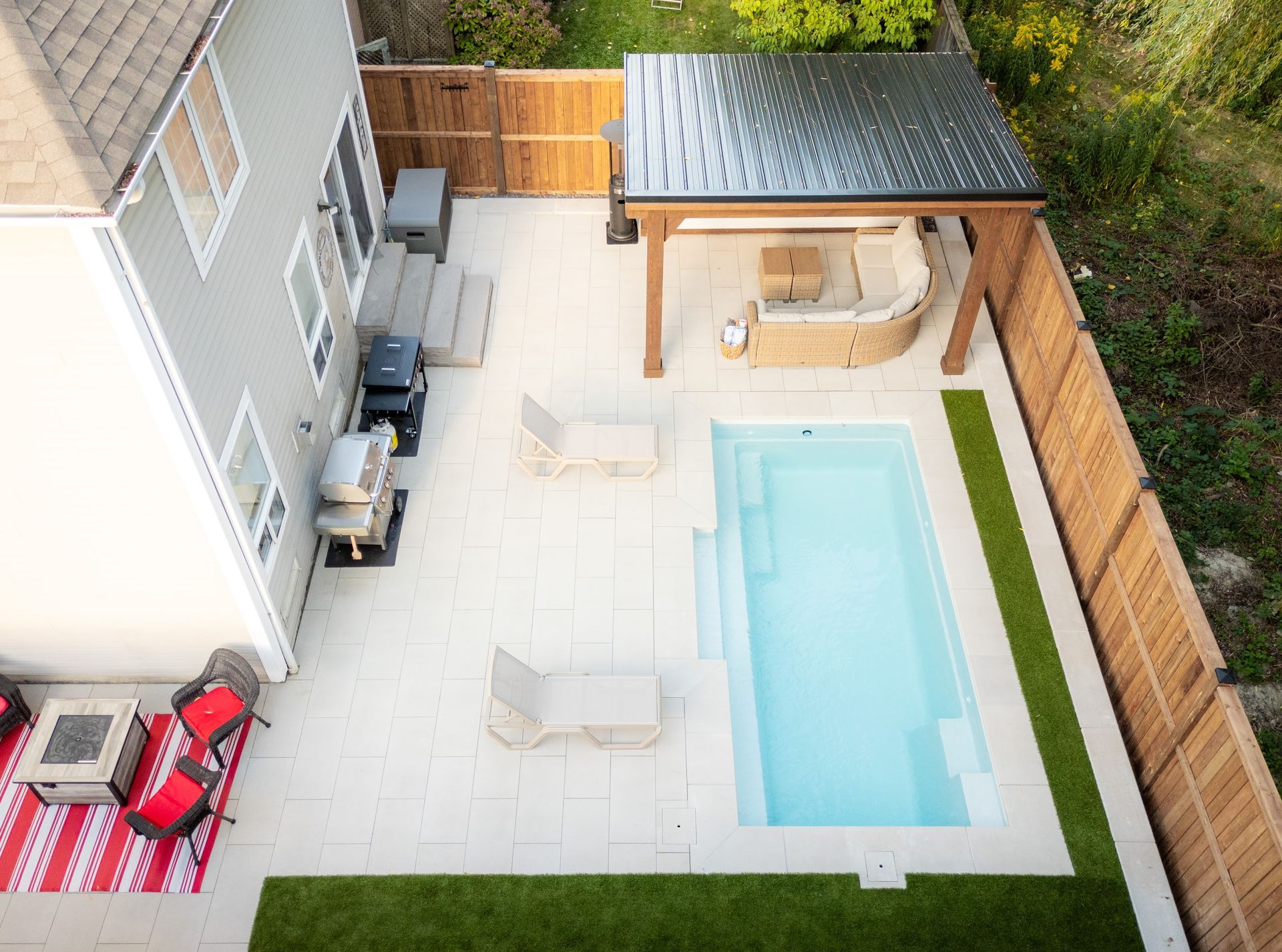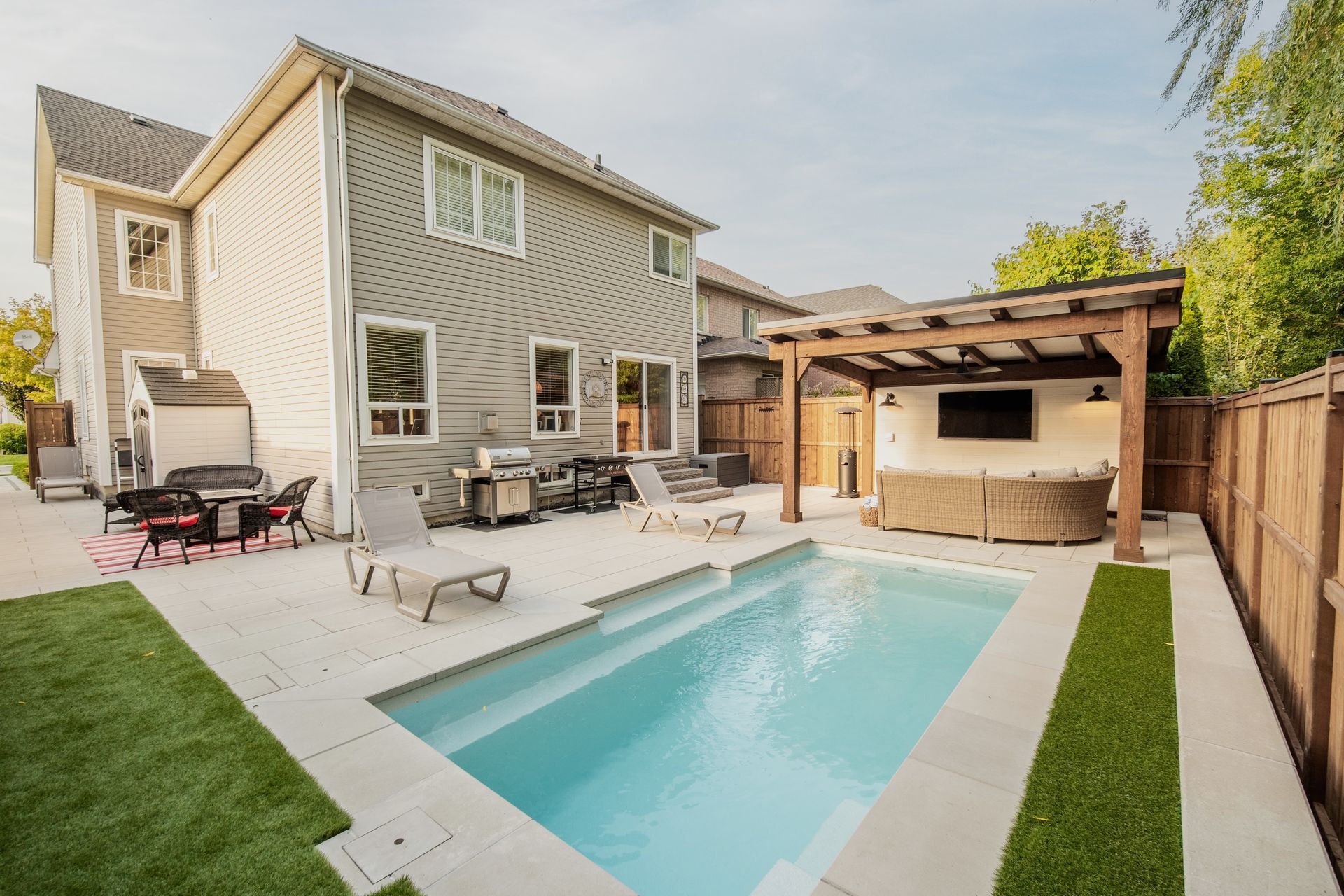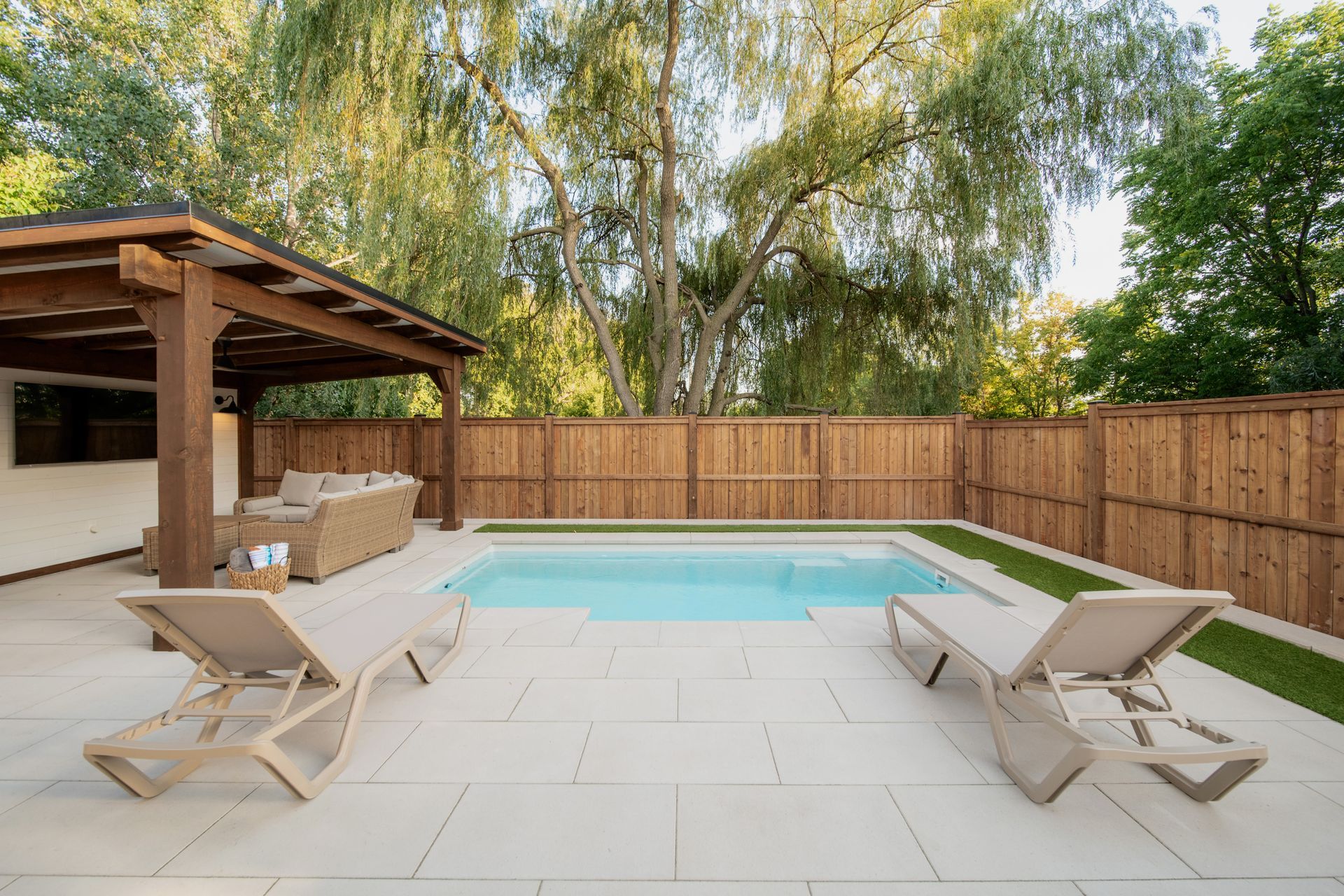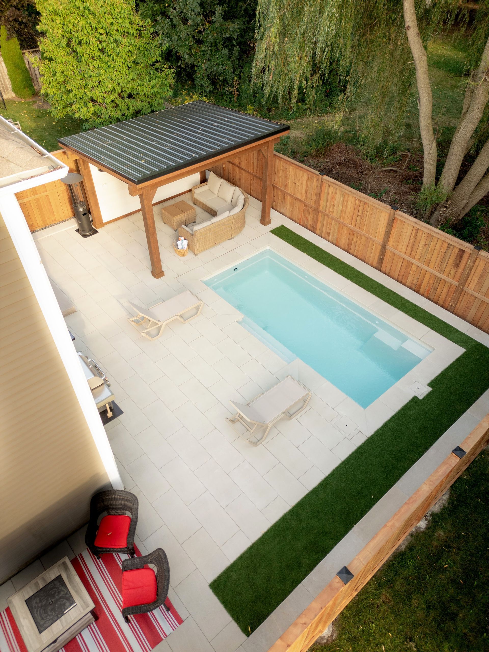 At the heart of the transformation is a Latham fiberglass pool, model Tuscan 11x20, designed for both beauty and convenience. Its compact yet elegant shape makes it perfect for smaller spaces, while still providing plenty of room for relaxation and recreation. Paired with the modern patio and pavilion, the pool completes this Brooklin backyard oasis — a seamless blend of craftsmanship, comfort, and contemporary design.