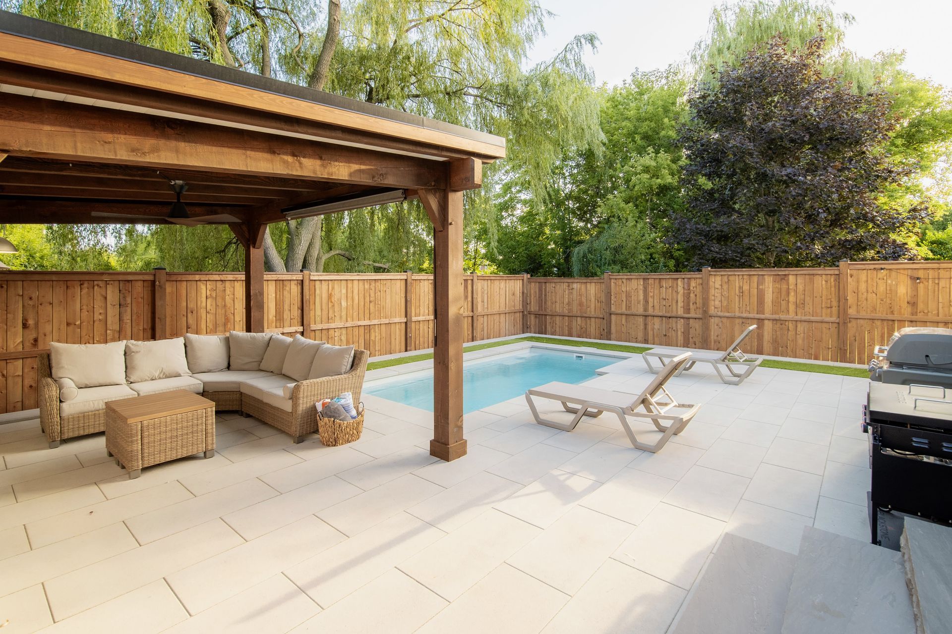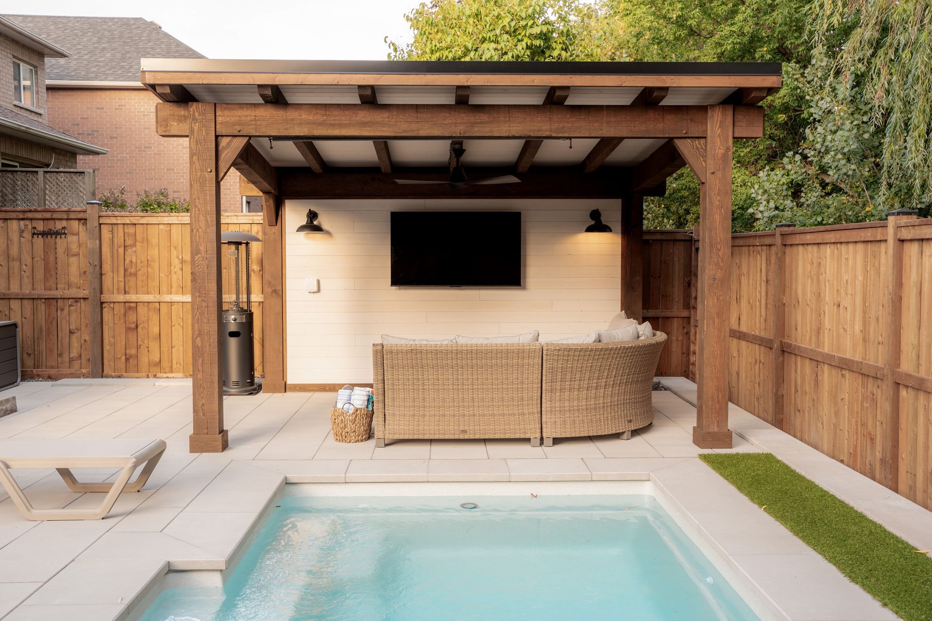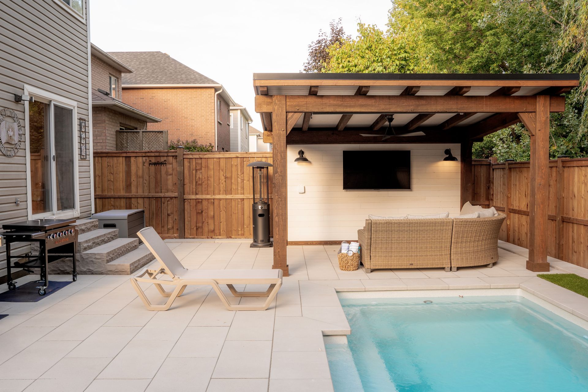Brooklin Backyard Transformation with Unilock Stone, Artificial Turf, Timber Pavilion, Latham pool model Tuscan 11x20