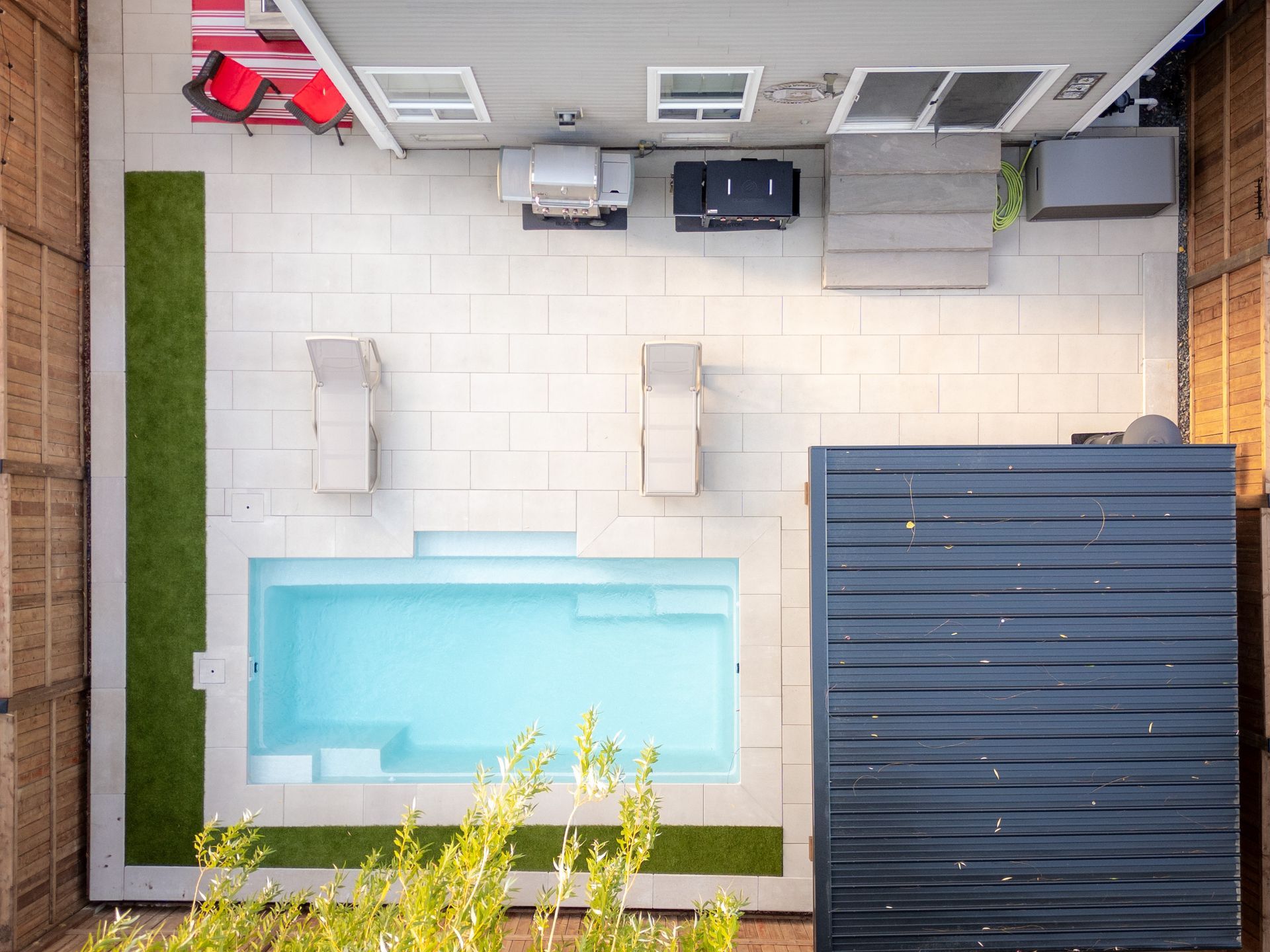 To complement the stonework, artificial turf was installed for a consistently lush and low-maintenance lawn. This modern alternative to natural grass ensures year-round greenery without the need for mowing or watering, while offering a soft, natural look that enhances the poolside atmosphere.