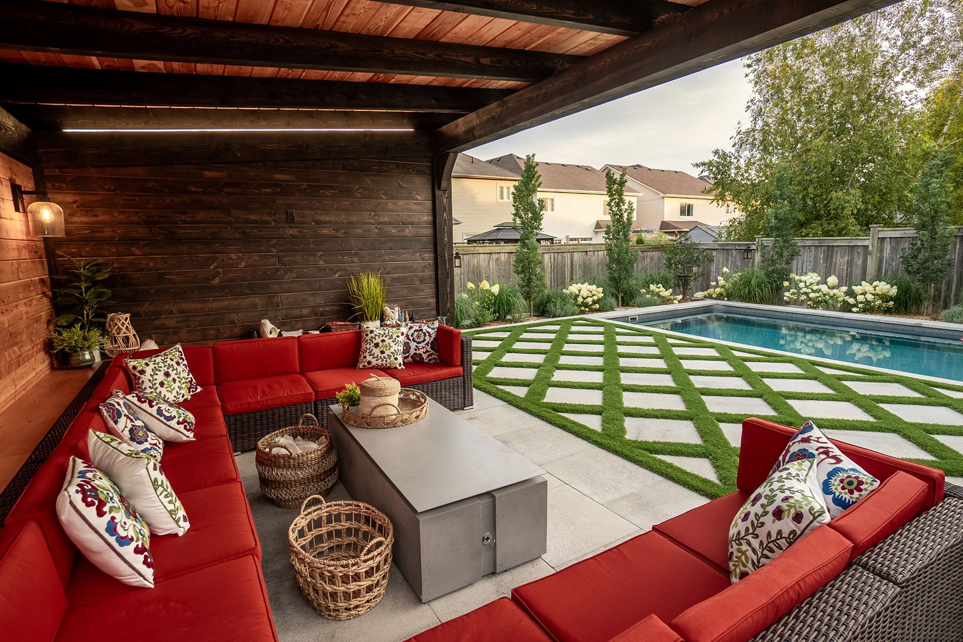 A standout feature of this project is the custom-built cabana and pool house, blending luxury with practicality. With warm wood finishes and modern black accents, this structure offers a shaded retreat for lounging, entertaining, or enjoying an evening by the pool. Thoughtfully designed lighting and built-in seating make it both inviting and functional, completing the space as an all-season outdoor escape.